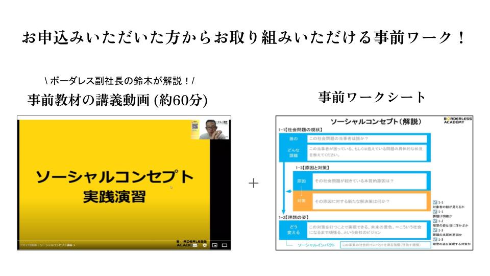 事前教材ではボーダレス・ジャパンが事業立ち上げでビジネスプランを描く前に必ず取り組む「ソーシャルコンセンプトシート」を使って「解決したい社会課題」について受講までの期間でじっくり深掘りができます。まだ解決したい社会課題のテーマが決まっていない方でも安心してご受講いただけます!