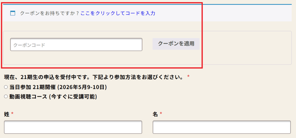 お申込みフォームのクーポンコード入力欄 ↓