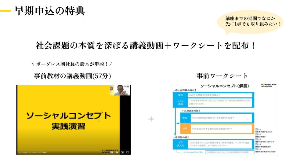 「講座までの期間で1歩でも先になにか取り組みたい」というご要望にお応えするかたちで、集中講座をお申し込みいただいた方から、社会課題の本質を深ぼる「講義動画」+「ワークシート」をお配りいたします。