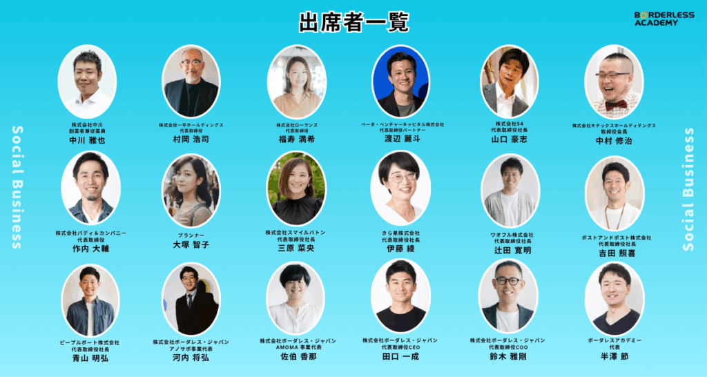 累計120名以上の社会起業家が誕生、世界14カ国50以上のソーシャルビジネスを展開するボーダレス・ジャパンが運営するソーシャルビジネススクールです。